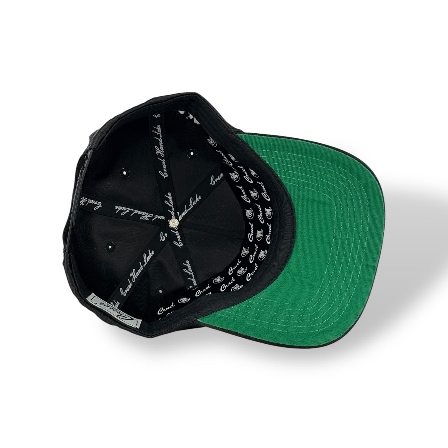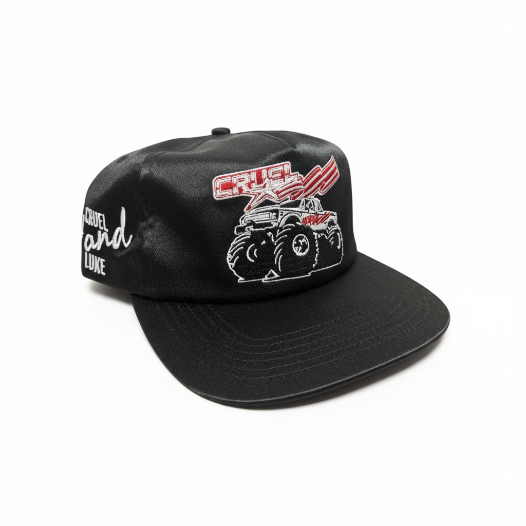 The 4x4 Hat is an all-black satin snapback. It features our embroidered flat-stitched monster truck design on the front and a flat-stitched Cruel Hand Luke logo on the side.