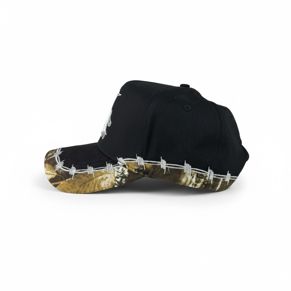 The Bison Barbwire Hat is a structured A-frame 5-panel snapback. It features a cotton crown split by a metallic barbwire design with tree camo paneling. The brim carries the same split design — black suede transitioning into tree camo. Under the brim features our Cruel logo in 3D puff print.