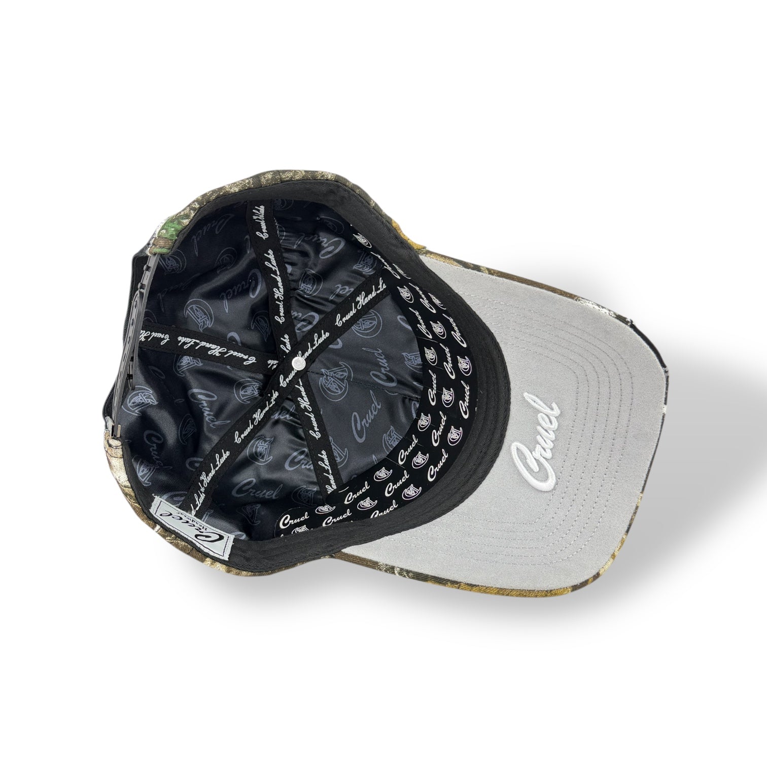 • Black suede brim transitioning into tree camo